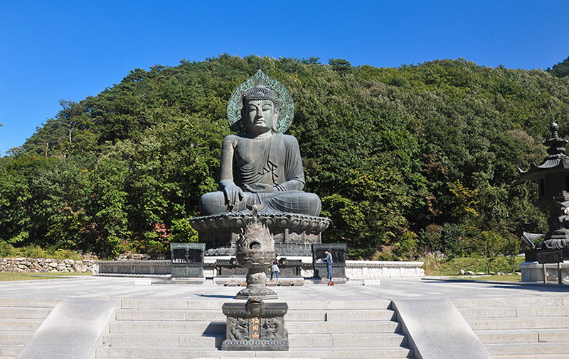 Der erste Kilometer ist wirklich mehr Spaziergang als Wandern: Die Wege sind asphaltiert und es gibt mit Statuen, Palästen und Tempeln viel entlang des Weges zu erkunden und besichtigen. Nach ca. einer Stunde Laufen kommt man zur Buddhistischen Anlage Gyejoam, die zur Meditation einlädt. Dort seht auch ein 2,5 Meter großer Wackelfelsen, an dem jeder sein Glück versuchen kann die 16 Tonnen in Bewegung zu setzten (leider habe ich kein Bild davon). Ab dem Felsen folgt der letzte und anstrengendste Teil bis zum Gipfel. Hier geht es großteils über Treppen, Brücken und Leitern. Ohne diese wäre der Felsen nur für richtige Bergsteiger zu erreichen. Oben angekommen hat man einen tollen Ausblick über den sonst fast ausschließlich grünen Park und bei gutem Wetter bis hin nach Sokcho zum Ostmeer. Auf der Aussichtsplattform gibt es sogar einen Mini Kiosk der kleine Snacks und Getränke (zu Mondpreisen versteht sich) anbietet. Da es nur einen Weg zum Ulsanbawi gibt, ist der Rückweg der selbe, nimmt jedoch ca. 30 Minuten weniger Zeit in Anspruch.