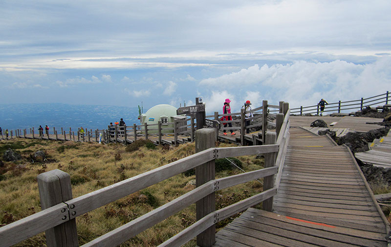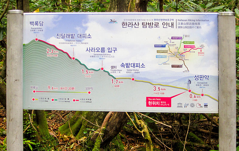 Unsere letzte Tour sollte uns zum dem, mit 1950 Metern, höchsten Punkt in Südkorea führen. Dieser befindet sich auf dem Vulkankrater Hallasan in der Mitte von Jeju Island. Auch der Hallasan befindet sich in einem Nationalpark, der nach dem Vulkan selbst benannt ist. Dieser beheimatet über 1.800 verschiedene Pflanzenarten und ca. 4000 Arten von Tieren, wovon 3.300 Insekten sind. Um die Natur zu schützen sind nicht immer alle Wege im Park zugänglich, auch auf den Gipfel führen nur zwei Wege. Der Seongpanak Trail mit 9,6km und der damals leider geschlossene Gwaneumsa Trail mit 8,7km. Der Eingang zum Trail liegt auf 750m und ist von Jeju Bus Terminal mit der Linie 781 halbstündlich zu erreichen. Die Parkverwaltung veranschlagt 9,5 Stunden für Auf- und Abstieg über den Seongpanak Trail, was wir inklusive einiger Pausen nicht ganz benötigt haben. Da es in Korea um 18 Uhr auch schon immer sehr dunkel ist, empfiehlt es sich die Tour spätesten um 8 Uhr zu starten.