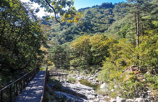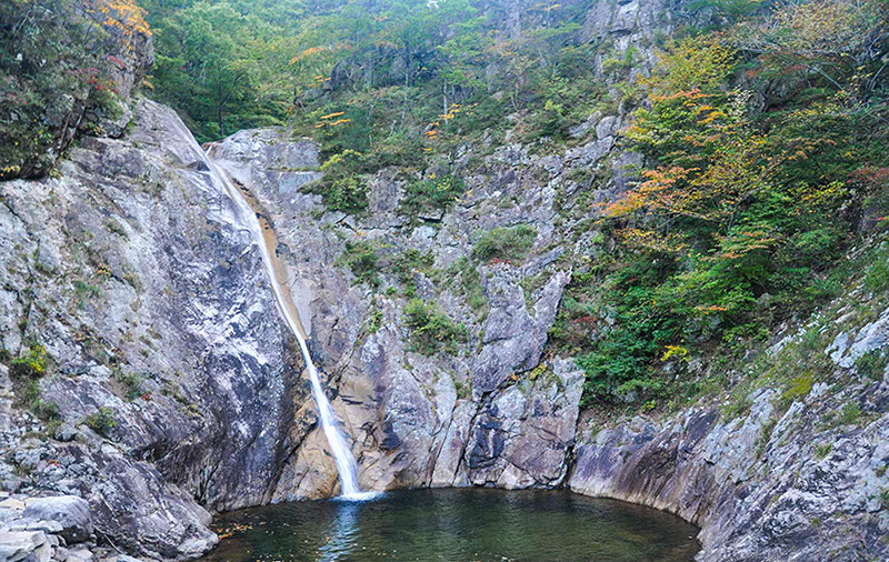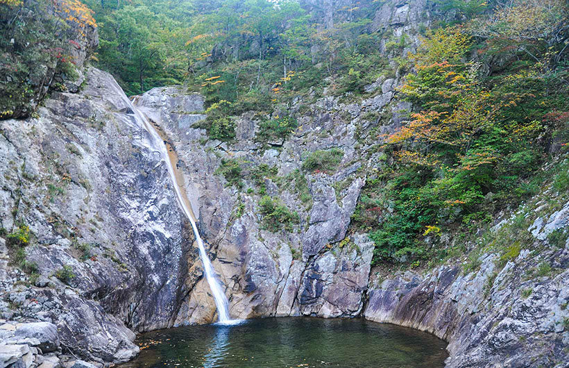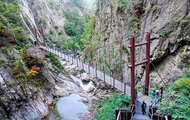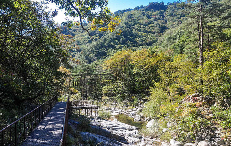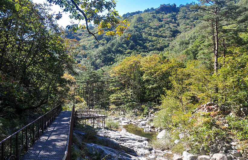 Die zweite, wesentlich kürzere, Tour führte uns zu einem Wasserfall, der eher ein 40m hoher Sturzbach ist. Der Weg verläuft durch ein felsiges, aber dennoch sehr grünes Tal und war bis auf unvermeidbare Brücken und Treppen zu unserer Freunde eher naturbelassen. Leider war die Tageszeit für den Weg nicht optimal gewählt, da das Tal von Nord nach Süd verläuft und somit komplett im Schatten lag. Auch hier ist leider wieder kein Rundweg vorhanden, somit ist der Rückweg gleich dem Hinweg. Zurück nach Sokcho ging es dann wieder mit dem Bus (ca. 30-40min).