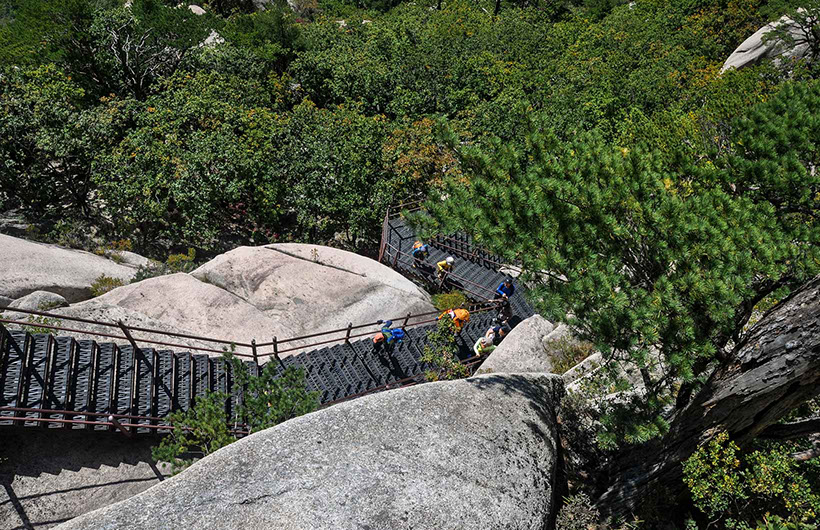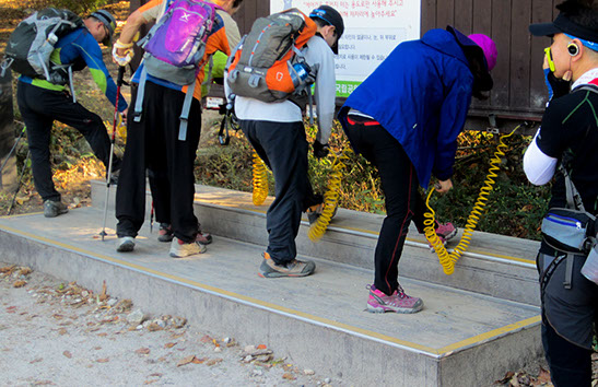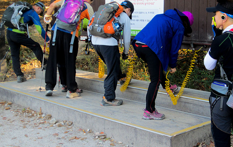 Um dann wieder die Kurve zum Wandern zu schlagen, wäre noch etwas Generelles zum Wandern in Korea zu erwähnen: Wandern ist Nationalsport Nummer 1 und wird hier schon fast etwas auf die Spitze getrieben. Selbst für die kleinste Tagestour rüsten sich die Koreaner mit Hightech Funktionsbekleidung und sonstiger Ausstattung gleich einer Everest-Besteigung aus. Dabei sind die Top-Routen in den Nationalparts teils so gut ausgebaut, dass man sie eigentlich in normalen Straßenschuhen laufen könnte. Hier werden nicht nur Treppen über den Fels gebaut, diese werden auch noch mit Gummimatten bedeckt, was ich doch ziemlich übertrieben und unschön finde. Nach der Wanderung darf man dann seine Schuhe an der Druckluftstation beim Parkeingang von Staub befreien, damit alles seine Ordnung und Sauberkeit hat.