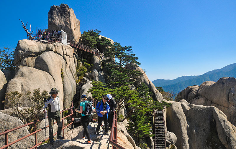 Der Park bietet viele verschiedene Wege und verfügt sogar über eine Gondel, die zum Gwongeumseong fährt, von wo aus man angeblich die beste Aussicht über das Seoraksan Gebirge hat. Wir entschieden uns dafür das 875m hohe Ulsanbawi Felsmassiv in Angriff zu nehmen. Die Strecke ist einfach 4km lang und es werden insgesamt 4,5 Stunden veranschlagt. In unserem Reiseführer war der Weg wie folgt recht treffend beschrieben: Der erste Kilometer ist einfach, dann folgen 1,5km mit spürbarem Anstieg und die letzten 1,5km bis zum Gipfel über steile Treppen sind anstrengend.