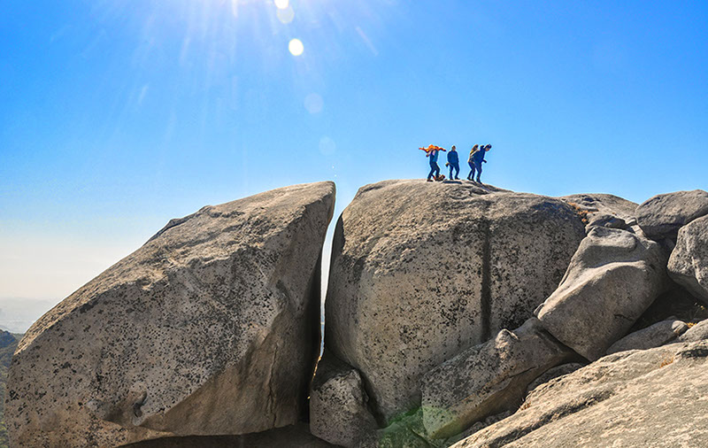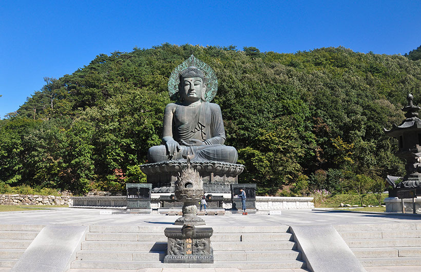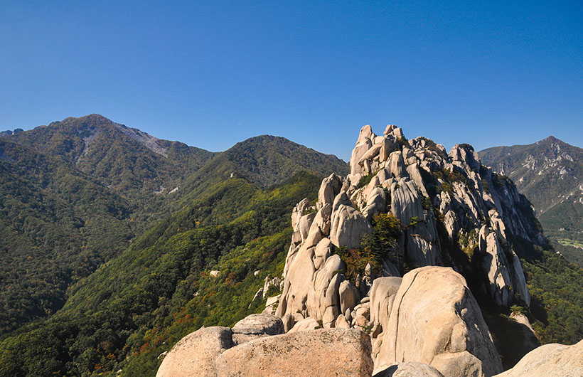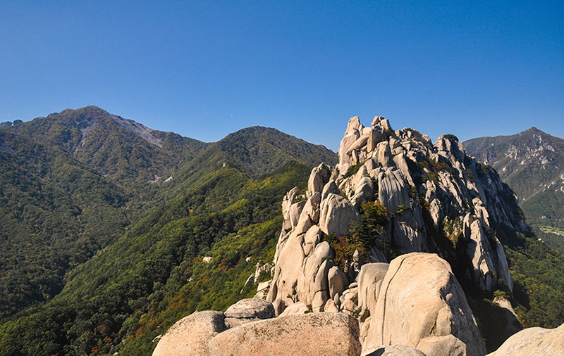 Der erste Kilometer ist wirklich mehr Spaziergang als Wandern: Die Wege sind asphaltiert und es gibt mit Statuen, Palästen und Tempeln viel entlang des Weges zu erkunden und besichtigen. Nach ca. einer Stunde Laufen kommt man zur Buddhistischen Anlage Gyejoam, die zur Meditation einlädt. Dort seht auch ein 2,5 Meter großer Wackelfelsen, an dem jeder sein Glück versuchen kann die 16 Tonnen in Bewegung zu setzten (leider habe ich kein Bild davon). Ab dem Felsen folgt der letzte und anstrengendste Teil bis zum Gipfel. Hier geht es großteils über Treppen, Brücken und Leitern. Ohne diese wäre der Felsen nur für richtige Bergsteiger zu erreichen. Oben angekommen hat man einen tollen Ausblick über den sonst fast ausschließlich grünen Park und bei gutem Wetter bis hin nach Sokcho zum Ostmeer. Auf der Aussichtsplattform gibt es sogar einen Mini Kiosk der kleine Snacks und Getränke (zu Mondpreisen versteht sich) anbietet. Da es nur einen Weg zum Ulsanbawi gibt, ist der Rückweg der selbe, nimmt jedoch ca. 30 Minuten weniger Zeit in Anspruch.