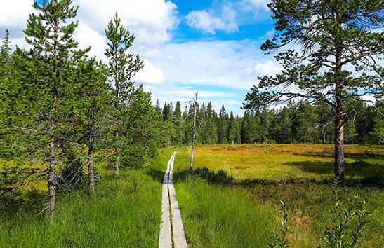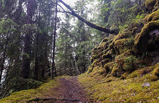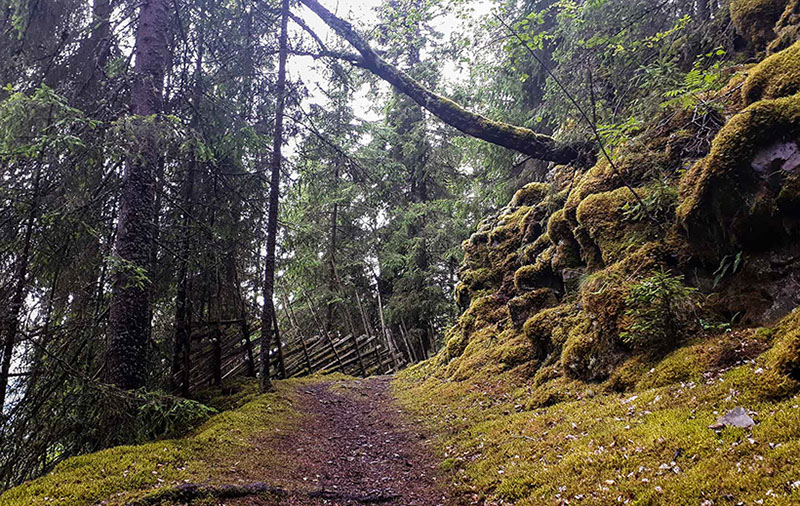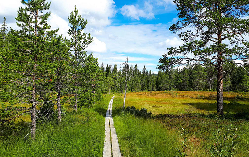 Nach dem Fjell - also schon im letzten Teil des Weges - fiel es mir erst einmal sehr schwer mich für den weiteren Weg zu begeistern. Viele der folgenden Etappen waren landschaftlich eher unspektakulär oder konnten leider nicht an das kurz vorher im Fjell erlebte heran reichen. Ein schönes Highlight bietet sich jedoch kurz vor dem Ende: eine Hochmoor-Landschaft in der man an unzähligen, teils mehr als mannshohen Wurzeln umgefallener Bäume vorbei kommt. Hier sind auch wieder Zickzack und der Gang über die Planke an der Tagesordnung.