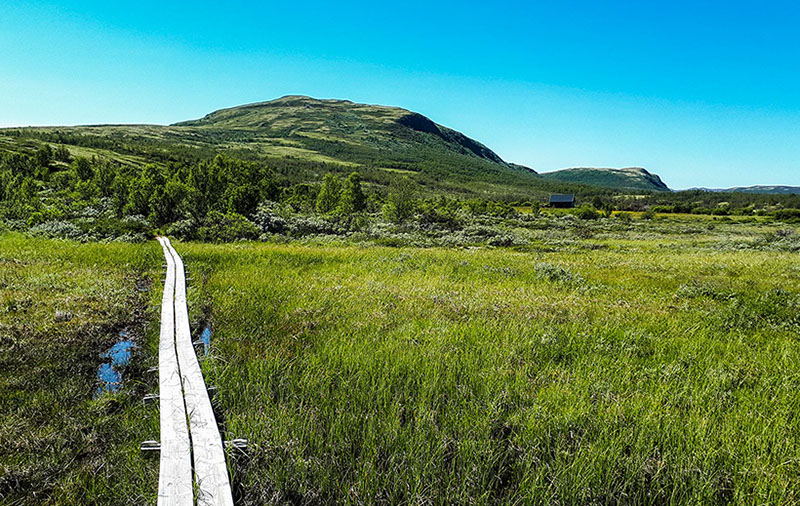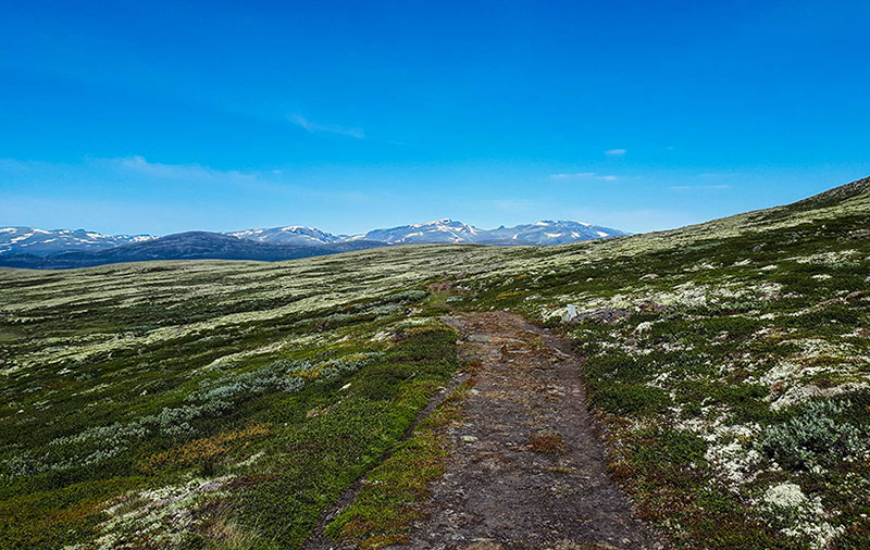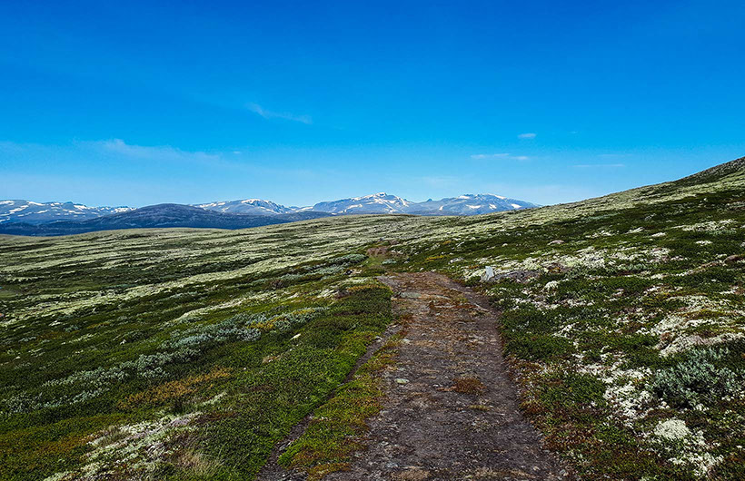 Der mit Abstand schönste Abschnitt befindet sich auf dem Fjell zwischen Dovre und Oppdal (km 508). Es erwarten dich karge Landschaften mit einer unendlichen Vielfalt an Flechten und Moosen in den unterschiedlichsten Grüntönen, gepaart mit der grandiosen Aussicht auf große Felsen und Bergspitzen, die auch im Sommer noch mit Schnee bedeckt sind. Dieser Abschnitt ist aber auch mit Abstand der anspruchsvollste, da täglich viele Höhenmeter zurückgelegt werden müssen. Ich hatte das Glück, dass ich dort oben das beste Wetter (fast schon zu warm, bei teils wolkenlosem Himmel) meiner ganzen Wanderung hatte und das Gelände verhältnismäßig trocken war. Trotzdem musste ich immer wieder im Zickzackkurs meinen Weg durch mooriges Gelände suchen, um darin nicht zu versinken. Das ist auf die Dauer sehr anstrengend und verlängert natürlich den tatsächlich zurückgelegten Weg um ein signifikantes Stück. Ich möchte um ehrlich zu sein nicht wissen wie die Strecke bei Dauerregen zu meistern ist. Etwas Vorsicht ist auch beim Laufen auf den schmalen Planken geboten, die über sonst unpassierbares Moor führen.