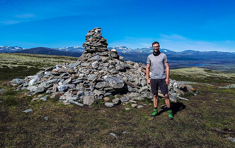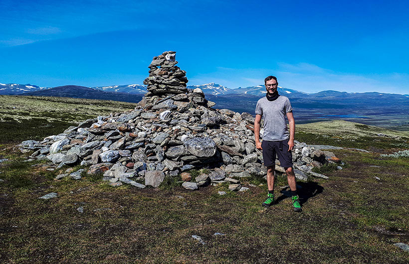 In der Herberge in Ringebu ist dann das Unglaubliche passiert: Ein weiterer Pilger aus Deutschland (gut zu erkennen am gelben Büchlein) kommt in die Herberge und fragt mich: „Bist du Christof aus Darmstadt? Ich lauf dir schon Tage hinterher.“ Es stellte sich heraus, dass er meinen Namen und Wohnort schon in einigen Wegbüchern gelesen hatte und aus meiner direkten Nachbarschaft in Darmstadt kam. Aufgrund unseres gemeinsamen Backgrounds hatten wir uns natürlich viel zu erzählen. Kim hatte jedoch weniger Zeit zur Verfügung und nach 4 Tagen des immer wieder gemeinsamen Laufens musste er längere Etappen auf sich nehmen, um rechtzeitig in Trondheim anzukommen. Seit Hamar war auch Dorothea aus Erfurt eine immer wiederkehrende Begleitung, bis wir uns an einem der schönsten Punkte, der Allmannrøysa-Steinpyramide, leider verabschieden mussten. Doch dafür war Markus nach kleiner Verletzungspause wieder zurück und weitere Begleiter kamen, gingen oder blieben.