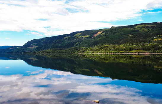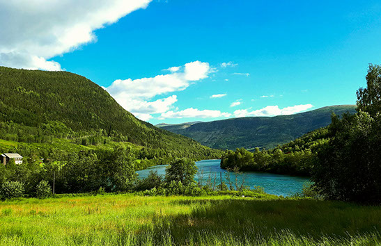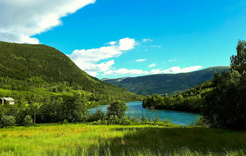 Mein zweiter Abschnitt führt durch das namensgebende Gudbrandsdal, das man bis Dovre (km 400) durchwandert. Die Natur ist spektakulärer, die Aussichten werden von Tag zu Tag immer schöner und der Asphaltanteil sinkt stetig. Auch in Sachen Höhenmeter wird es langsam spannender, somit natürlich auch anstrengender. Doch der Blick ins Tal auf den wunderschön grün und blau schimmernden Fluss entschädigt regelmäßig für das ständige Auf und Ab.