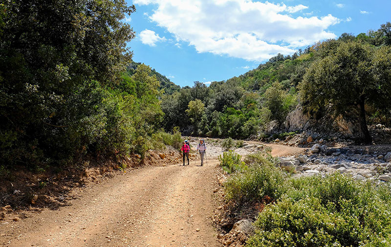 Die Warnung des Zeltplatz Personales nahmen wir ernst und deckten uns pro Person mit ca. 4 Liter Wasser ein. Für den Fall, dass wir bis zu unserem nächsten Etappenziel Cala Sisine nicht an Wasser gekommen wären, hätten wir noch genug Reserve gehabt, um am nächsten Tag die 16,5km bis zum Zeltplatz wieder zurück zu laufen. Der Weg war eine unbefestigte Straße, auf der man sonst nur mit Geländewagen fahren sollte und führte uns durch sehr trockenes, aber dennoch viel grünes Gelände. Die letzten zwei Drittel liefen wir parallel zu einem ausgetrockneten Flussbett, dessen Anblick uns jegliche Träume an frei verfügbares Trinkwasser zerplatzen ließ. Wir pausierten wieder in einer unglaublichen Felskulisse, nur dass wir diesmal nicht darauf hinab sahen, sonder hinauf und mitten darin waren.