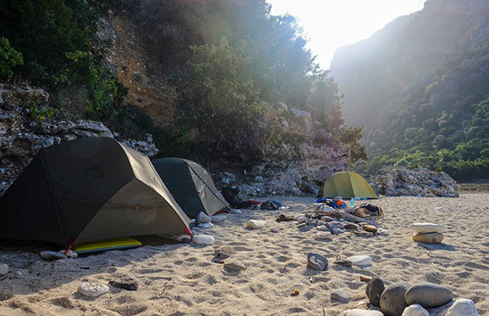 Kurz vor unserem Etappenziel Cala Sisine konnten wir Treiben an der Strandbar wahrnehmen und freuten uns, dass wir uns hier mit Wasser für weitere Etappen eindecken können. Den Preis pro Liter habe ich verdrängt, er war jedoch weit von einem Schnäppchen entfernt. Nach kurzer Rast an der Bar machten wir uns auf zum menschenleeren Sandstrand und schlugen unser Lager auf. Den weiteren Tag verbrachten wir mit Erkundungen, Wildschweine beobachten, Feuerholz sammeln und einem - temperaturbedingt - sehr kurzen Bad im Meer.