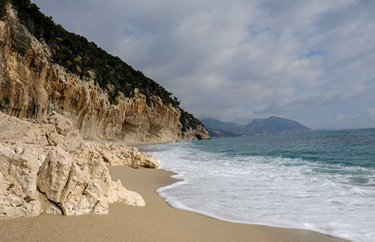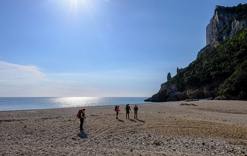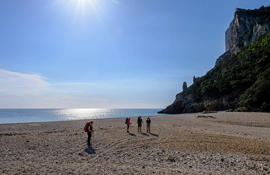 Jedoch stand für den heutigen Tag sowieso der Marsch zum Naturdenkmal Cala Goloritze an. Der Strand ist besonders für die 100m hohe Felsnadel L'Aguglia bekannt, die auch bei Freeclimbern sehr beliebt ist. Wir entschieden uns nicht für den direkten 3,5km langen Weg, sondern liefen einen großen Bogen zu Punta Salinas. Die extra Kilometer waren bestens investiert, da der Ausblick auf Cala Goloritze und die Felsenküste Sardiniens atemberaubend war. Nach einer Mittagspause mit Nickerchen ging es abwärts zum Strand, um uns von Nahem noch ein Bild machen zu können. Bei unserer Ankunft war es dann aber doch schon recht spät, daher konnten wir dort nicht mehr so lange verweilen, um den Campingplatz nicht erst im Dunklen zu erreichen. Der Weg mit seinen ca. 470 Höhenmetern führt vorbei an Felsenhöhlungen, die früher von Hirten genutzt wurden. Diese Etappe legten wir nur mit leichtem Gepäck zurück, da wir den Großteil unserer Ausrüstung praktischerweise beim Campingplatz zwischenlagern konnten.